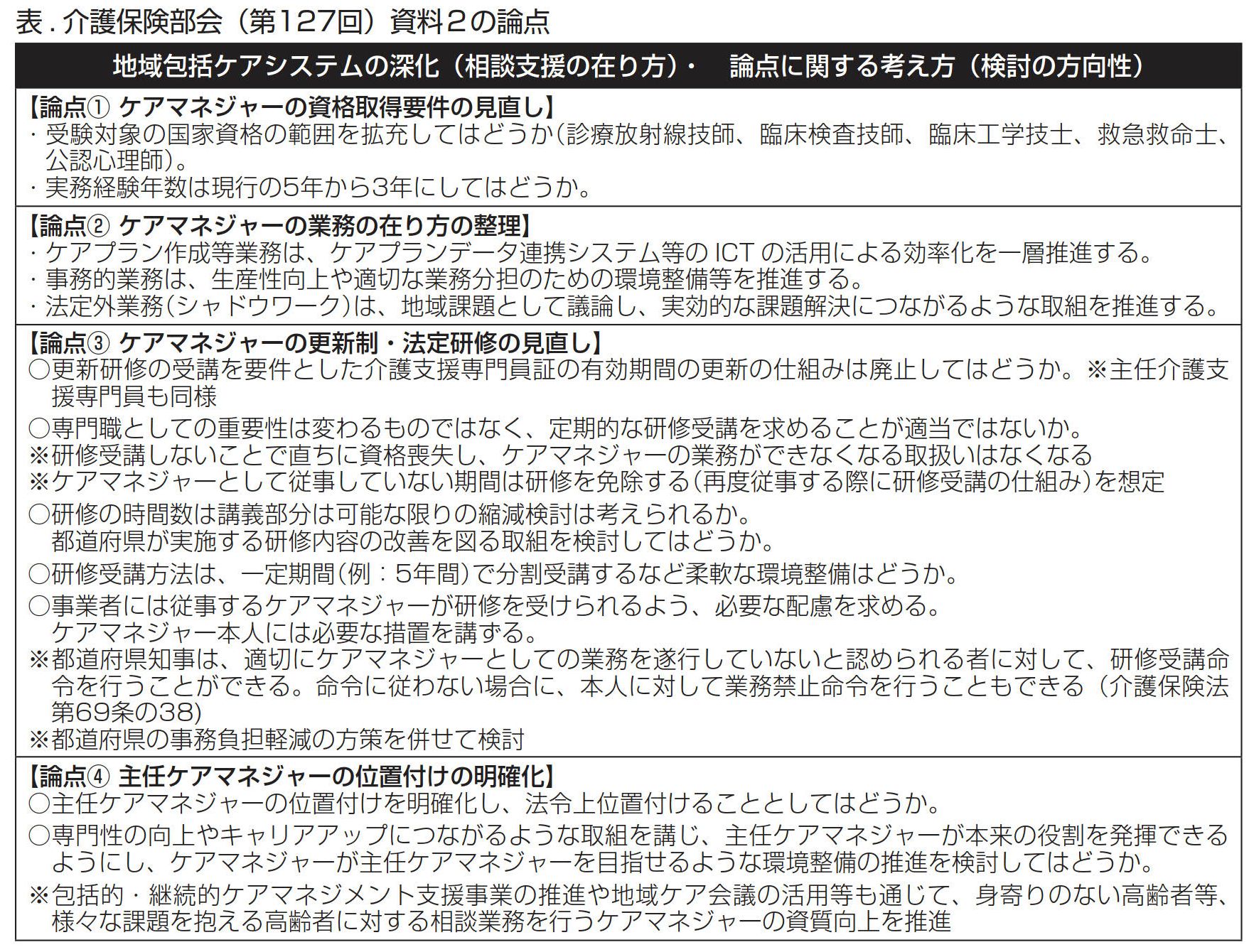 【論点④主任ケアマネジャーの位置付けの明確化】は、主任介護支援専門員が活躍できる環境整備に関する検討である。介護支援専門員は法第7条に規定されている。主任介護支援専門員は地域のケアマネジメントの中核的な役割を果たしているが、地域包括支援センターの主任介護支援専門員を除けば、法令上の位置づけは不明確である。こうしたことも含めて議論が必要だろう。