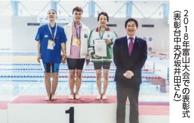 6月に滋賀で行われた関西マスターズ水泳選手権大会で世界新記録を樹立した。4×200mの男女混合フリー(自由形)リレー。出場4人の年齢合計が320〜359歳の部で、坂井田さんら4人はちょうど計320歳だった。これまでの記録を27秒も縮める31分39秒30をたたき出した。