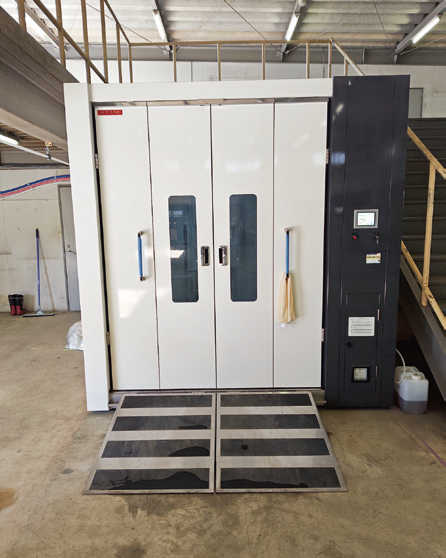 開設にあたり、洗浄品質向上と作業工程の標準化・効率化を図るため、アタム技研の専用機器を採用。ベッドや車いす、手すりなどをカゴ台車ごと出し入れできる多目的洗浄機と高速乾燥機を2台ずつ導入した。「以前は、ベッドなどは手作業での清拭や高圧洗浄で対応していたが、業務負担と仕上がりのムラが課題だった」と泉博営業部長。「実機での洗浄評価テストで洗浄能力の高さを確認し、導入を決めた。洗浄工程の作業効率は以前の倍以上に高まり、仕上がり品質も高いレベルで安定している」と話す。