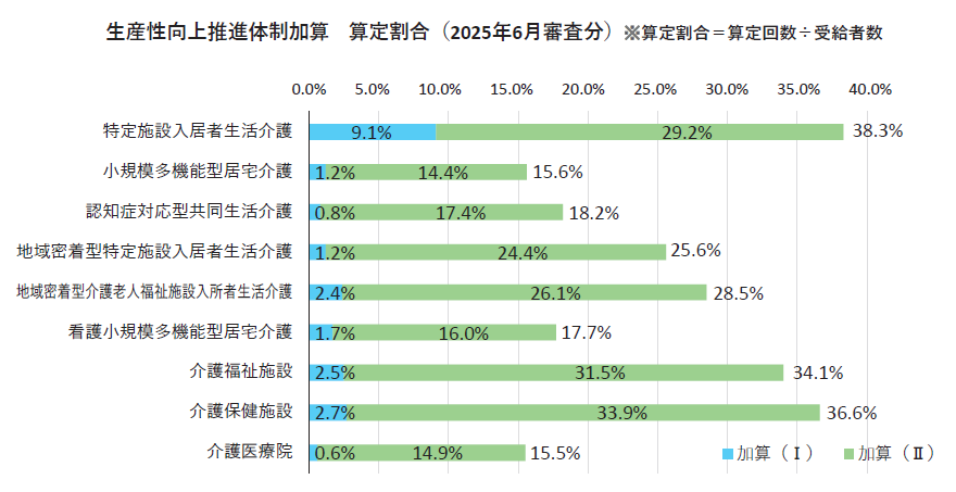 厚労省の介護給付費実態統計では、昨年5月実績で同加算(Ⅰ+Ⅱ)を算定する利用者の割合は特定施設38.3%、特養34.1%、老健36.6%、介護医療院15.5%など。加算Ⅰは特定施設が9.1%で最も高い(グラフ)。