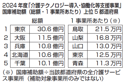 なお、介護テクノロジーの導入は医療介護総合確保基金(本予算)でも活用が可能だが、より生産性向上へのタスクが明確な同支援事業(補正予算)の創設以降、多くの都道府県は同支援事業を主体に運用。23年度補正+24年度基金の実績でみると、補正のみが38道府県、基金併用が7都県(栃木、東京、石川、三重、徳島、福岡、沖縄)、基金のみは新潟の1県、両予算とも無しが山口の1県だった。24年度補正予算の補助額(国庫補助分)は総額185.5億円。最も多い補助額は東京の30.6億円、全介護事業所で割った1事業所あたり補助額は鳥取が21.5万円で最高だった。新潟は23年に続き計上していない。
