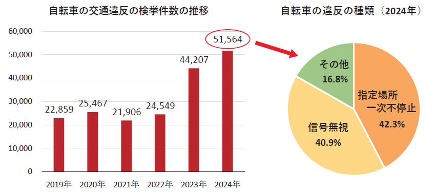 自転車の交通違反の検挙件数は24年で5.1万件。5年前の2倍以上に増加している(グラフ)。