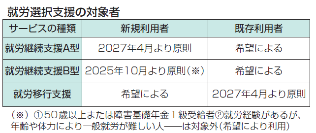 対象者は就労移行支援、就労継続支援(A型・B型)の利用者、その他利用希望者と特別支援学校高等部の生徒。就労B型の新規利用申請者はこの10月から原則実施され、27年4月より就労A型の新規利用者、就労移行支援の既存利用者も義務化となる。
