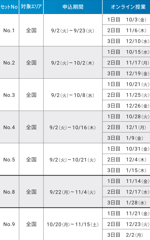 全国エリアでは現在以下の5期分の日程で申込を受付けている。