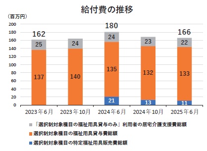 財政面では、制度開始直後の24年6月に販売費の発生により総給付額(選択制対象種目の貸与、販売、対象種目以外のサービス利用のない居宅介護支援費の合算)が前年同月比11.7%増の1億8043万円と一時的に増加したが、その後減少に転じ、25年6月時点では導入前と概ね横ばいの推移となっている。