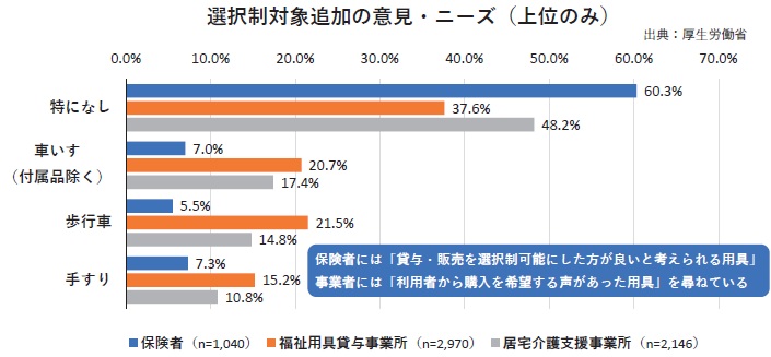 今後の焦点となる対象品目の拡大について、今回の調査では保険者とサービス提供者(福祉用具貸与事業所と居宅介護支援事業所)の双方に対し、拡大の適否やニーズを問い直している。保険者に対し「貸与・販売を選択可能にした方が良いと考えられる用具」を尋ねたところ、回答は「特になし」が60.3%と過半数を占めた。次いで、手すり(7.3%)、車いす(7.0%)、歩行車(5.5%)などが挙がったが、いずれも1割に満たなかった。
