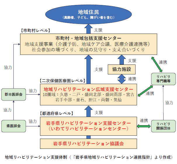 地域リハビリは22年に改訂した「岩手県地域リハビリテーション推進方針」がベース。年齢や障がいの有無に関わらず、誰もが住み慣れた地域で安心して暮らす「社会的包摂」(ソーシャル.インクルーシブ)の観点に立ったリハビリの提供体制をめざす。
