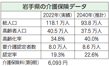 岩手県の65歳以上人口は2023年10月時点で40万3825人(前年比1422人減)、高齢化率は35.2%で全国平均29.1%を上回る。21年頃をピークに高齢者数は減少し始めているが、要介護認定者数は今後も増加傾向。22年の8.0万人(実績値)から、26年には8.2万人、30年に8.4万人になると見込まれる。