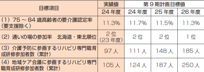 第9期介護保険事業支援計画の柱①地域包括ケアを推進するための仕組みづくり②介護を支える人材の確保と必要なサービスの基盤づくり③認知症とともに生きる社会づくり④高齢者が安心して暮らせる環境づくり――のうち、①では介護予防と地域リハビリテーションの推進を施策の一つに掲げ、要介護認定率の伸び抑制などを目標値に定める。