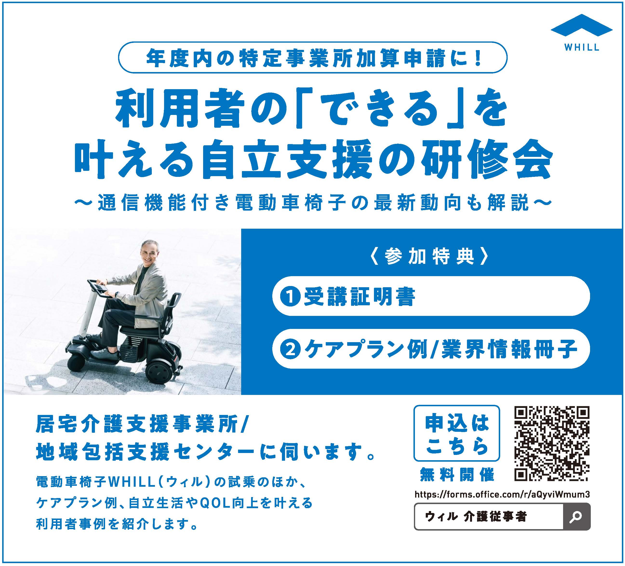 WHILL(東京都品川区、杉江理社長)は、主任ケアマネジャーを主な対象とし、特定事業所加算の申請などに対応する個別研修会の申込みを受け付けている。今年12月までに希望する居宅介護支援事業所や地域包括支援センターへ、同社や貸与事業者のスタッフが訪問し、無料で研修を実施。加算要件の充足を支援すると同時に、電動車椅子を活用した利用者の自立支援やQOL向上につながる実践的な知見を提供する。