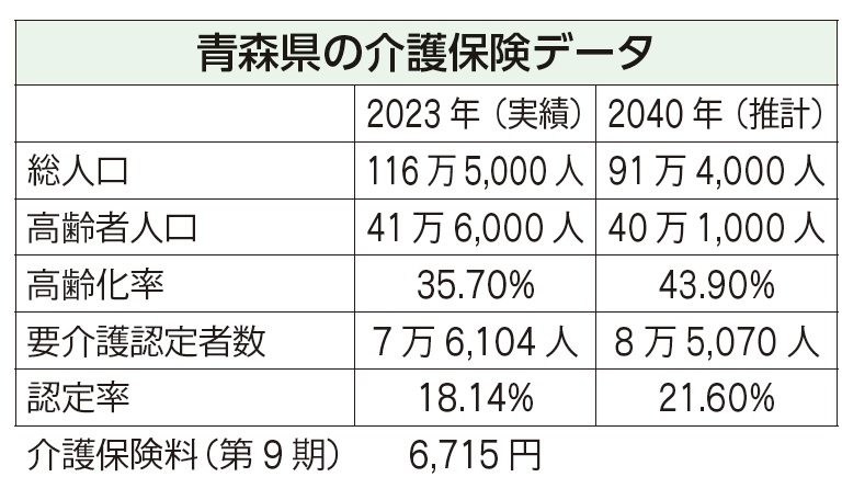 青森県の高齢化率は2025年時点で36.4%と全国平均よりも高く、さらに40年には43.9%に達する。高齢者人口は25年に約42万1000人に増加した後は減少傾向となる見込みだ。介護職員数は26年に2万6968人と推計されている。団塊ジュニア世代が65歳以上となる40年には現在の1.2倍の3万4217人が必要となり、供給見込数と比較して1万2043人の介護従事者の不足が予想される。