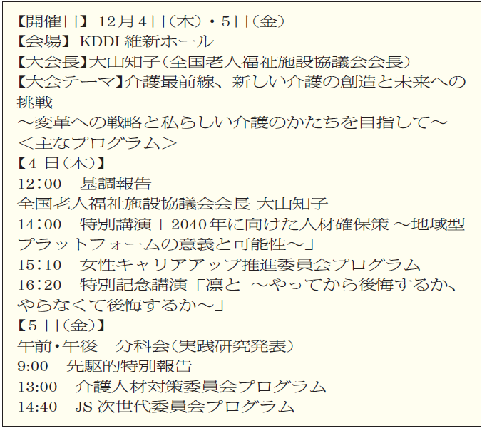 また、女性活躍の推進にも力を入れたい。そもそも介護は女性の力なくして成り立たない。大山会長が全国老施協で初めての女性会長ということもあるが、女性の活躍の場をさらに広げていきたいとの思いを込めたプログラムも用意している。
